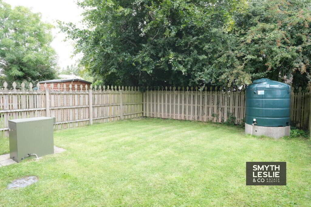 Fully enclosed lawned, private garden to rear. Pedestrian side alleyway access from front of house. Lawned garden to front, tarmac driveway and parking area. PVC oil tank and oil fired boiler to rear.