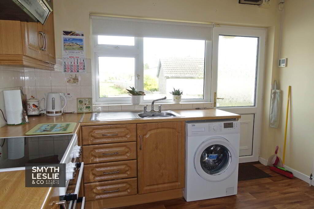 Fitted kitchen with a range of high & low level units, stainless steel sink unit, extractor fan hood, plumbed for washing machine, PVC exterior door with glazed inset, tiled splash back.