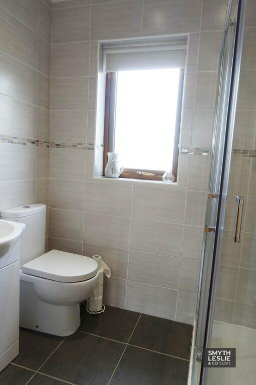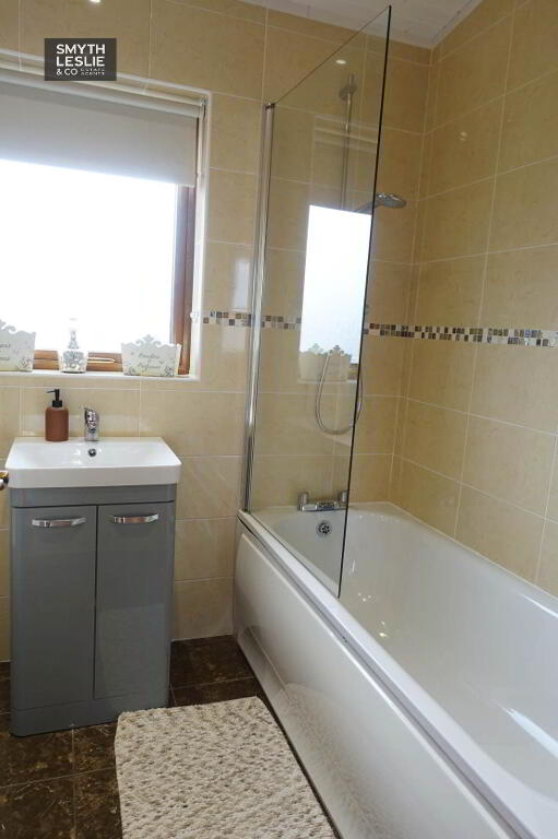 (widest points) White suite, thermostatically controlled shower over bath, shower screen, heated towel rail, fully tiled, panelled ceiling, recessed lighting.