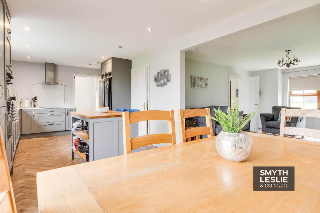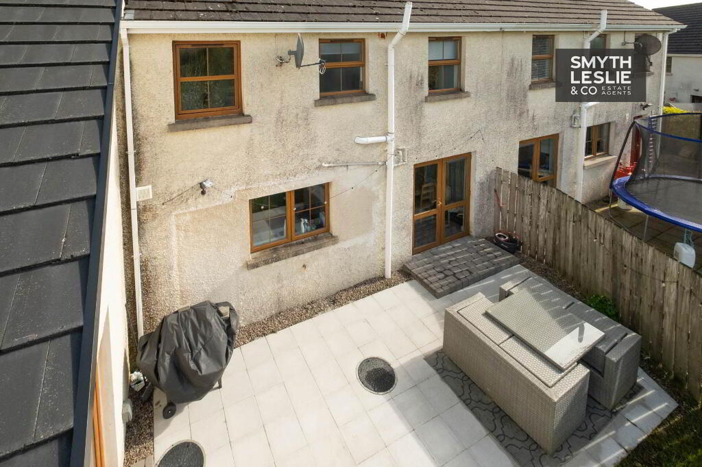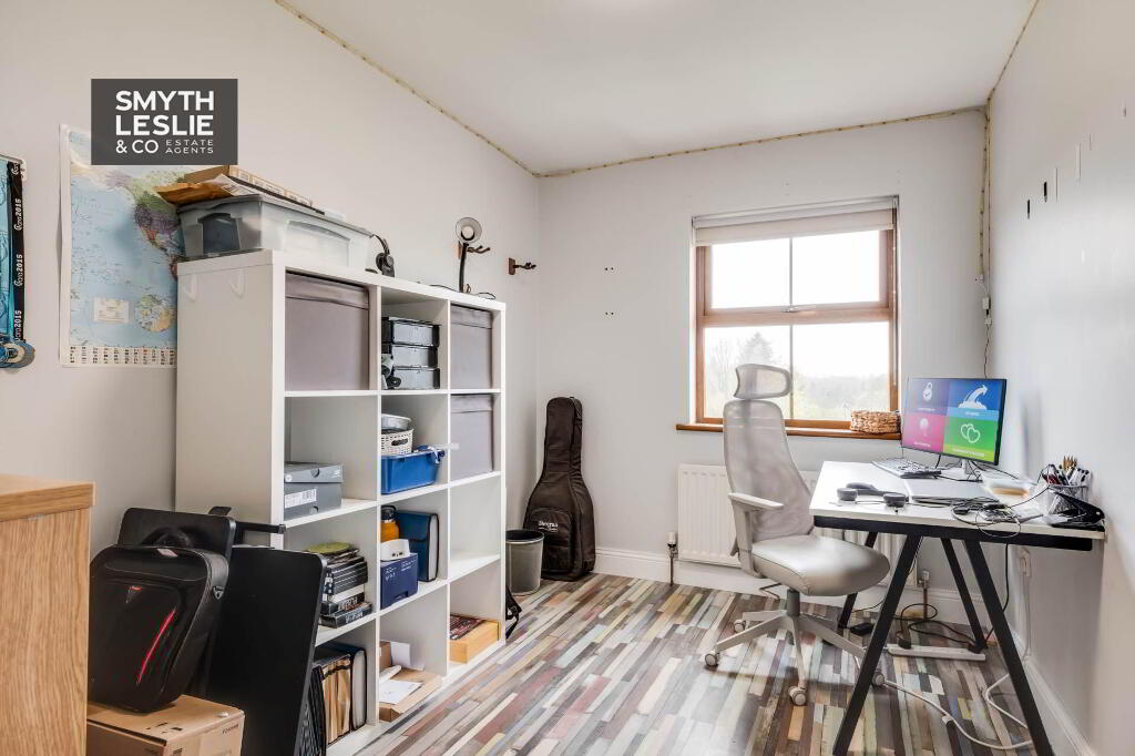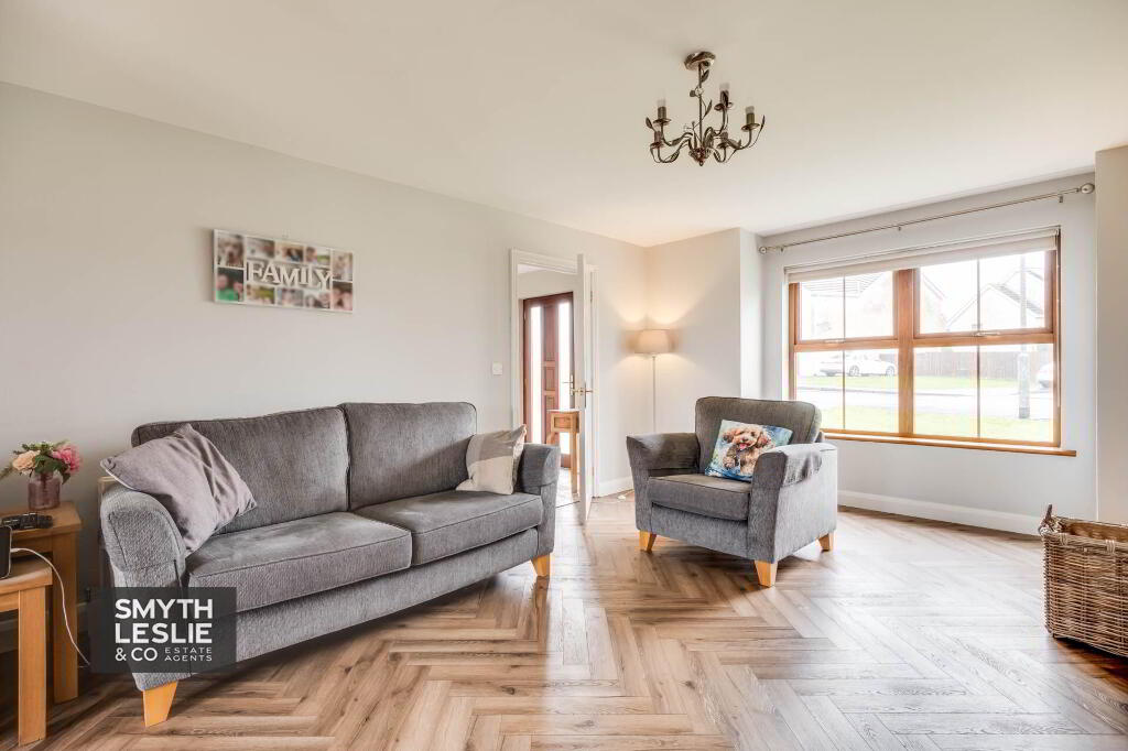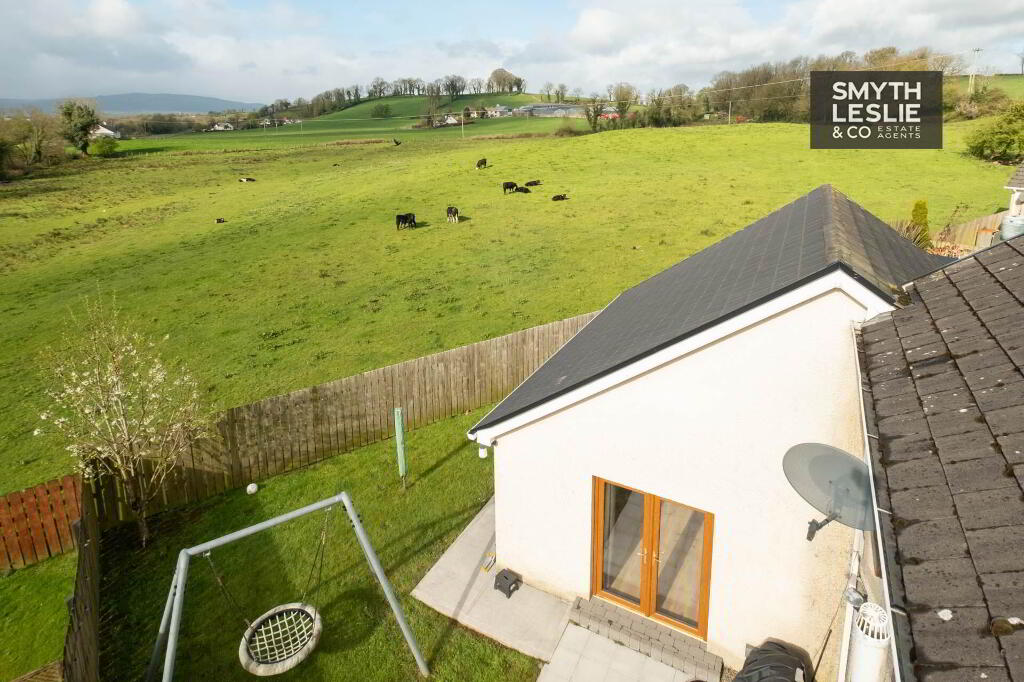 Positioned on a corner site, the property benefits from spacious parking to the front, providing both practicality and ease of access. To the rear, the grounds are thoughtfully laid out to offer an easy to maintain, south facing garden, featuring a paved patio area ideal for outdoor relaxation, alongside a lawn that overlooks farmland to the rear. The garden further enjoys attractive views towards Culciagh Mountain, enhancing the sense of connection to the surrounding landscape and countryside.