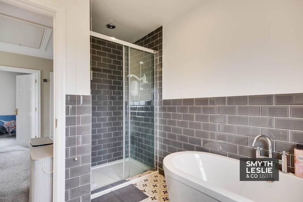 Contemporary suite, wet room shower with electric shower, glazed shower screen, tiled walls, vanity unit, heated towel rail, recessed sensor lighting.