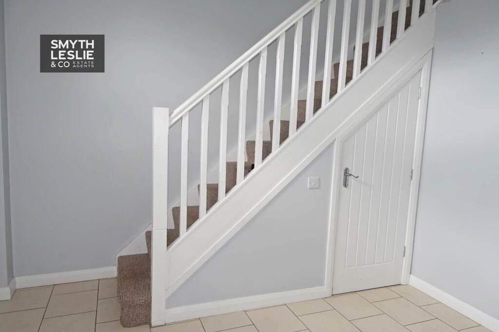 PVC exterior door with fanlight window, under stairs storage, tiled floor.