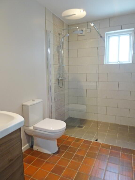 Bathroom: 9’3 x 5’8 White suite, step in shower cubicle with wet room floor, thermostatically controlled shower, vanity unit, recessed lighting.