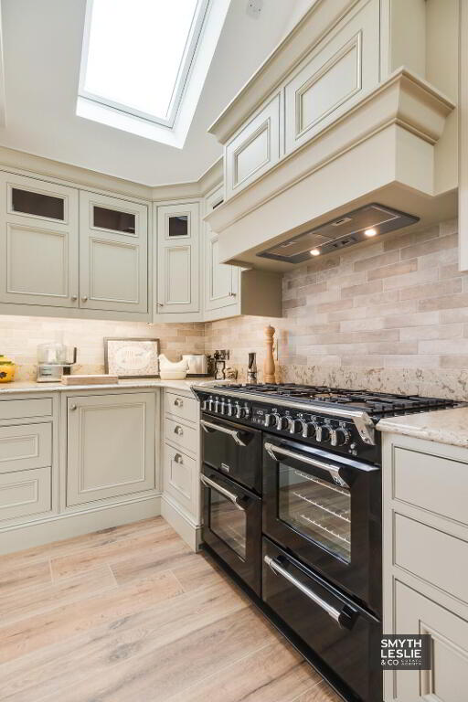 Luxury fitted Kitchen with an extensive range of high and low level units, granite work top, island unit including breakfast bar, basket shelving, glazed display units, wine rack, ceramic sink unit, integrated dishwasher, recessed and unit lighting, fitted window seat, high ceiling feature, wood grain tiled floor, extractor fan oven/range cooker.