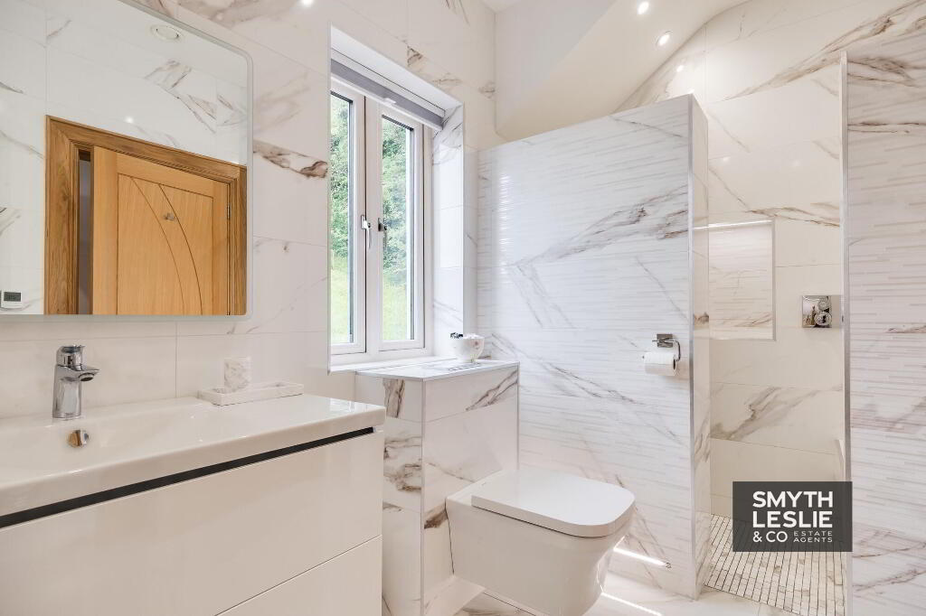 Luxury finish white suite, wet room shower with walled cubicle, shower seat and inset shelving, thermostatically controlled shower with push button control, fully tiled, concealed wc with push button flush, vanity unit, heated towel rail, recessed and mirror lighting.