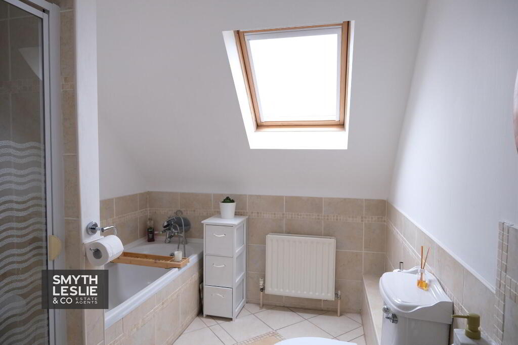 with 3 piece suite, step in shower cubicle with electric shower fitting, telephone hand shower attachment to bath taps, velux window, tiled splashback, half tiled walls, tiled floor.