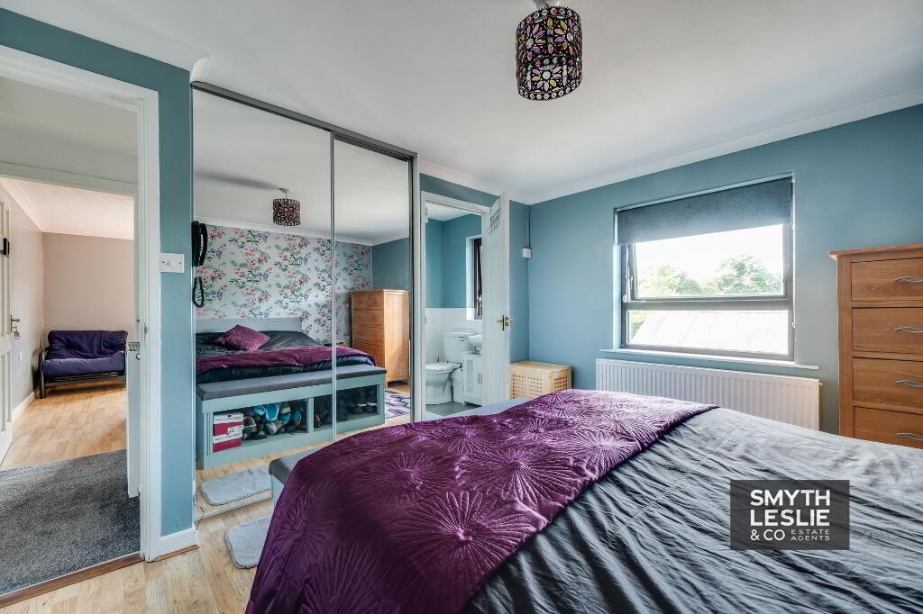 Fitted sliderobes with mirrored doors, laminate floor, fitted dressing table.