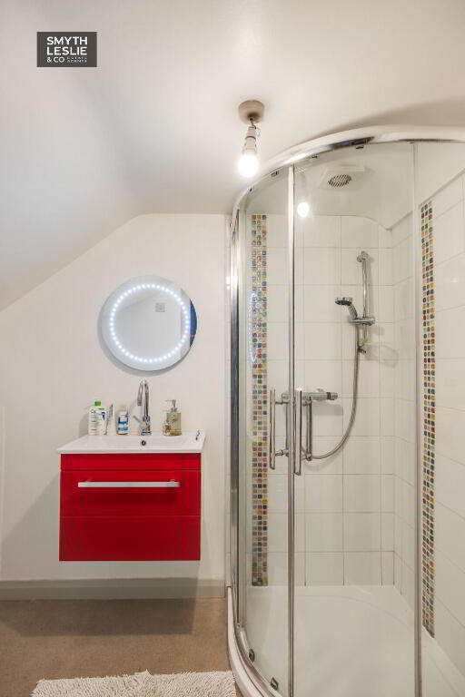 Ensuite: 7'6" x 5'6" White contemporary style suite, concealed wc with push button control, step in shower cubicle, vanity unit, cushion flooring & tiled splashback.