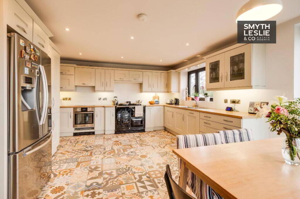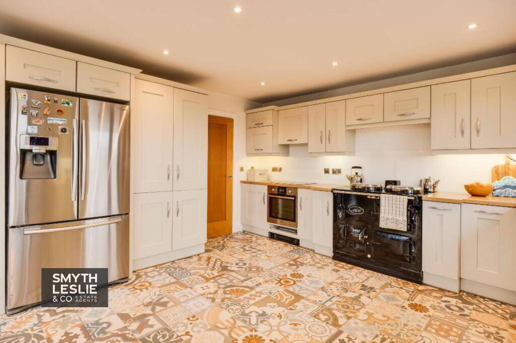 Fully fitted Kitchen with an extensive range of high & low level units, AGA oil fired cooker, integrated hob, oven & grill, dishwasher, fridge freezer, decorative tiled floor, recessed lighting, feature corner window with views towards the River Erne.