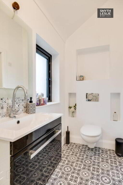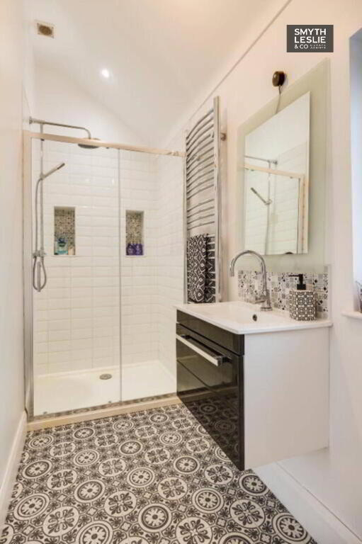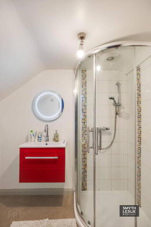 White contemporary style suite incl. shower cubicle with thermostatically controlled shower, concealed wc with push button control, recessed shelving, vanity unit, heated towel rail, tiled splashback.