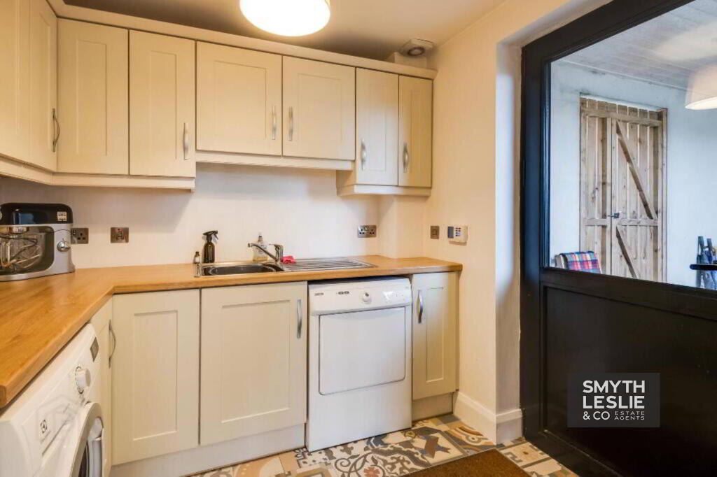 Fitted high & low level units, plumbed for washing machine, aluminium exterior door with glazed inset.