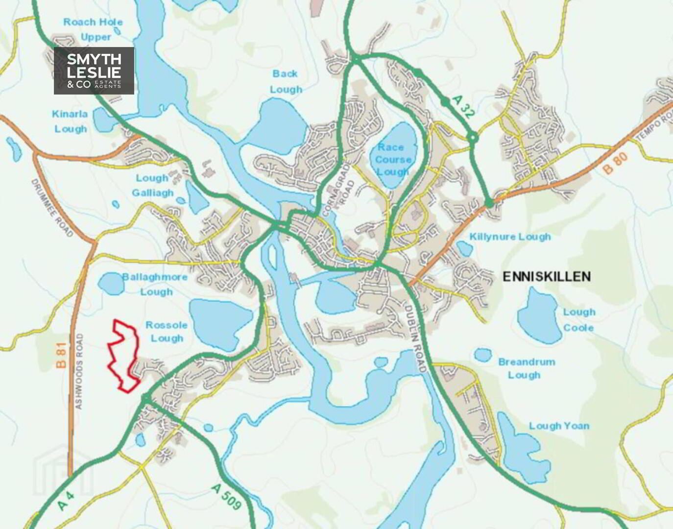 Perfectly located on the edge of Enniskillen`s development limits, adjoining the renowned Scaffog Avenue residential development, this c.27.38 acres of land offers an attractively sized piece of farmland with the excellent advantage of a long term investment opportunity afforded by its unique location and on the edge of Enniskillen town.