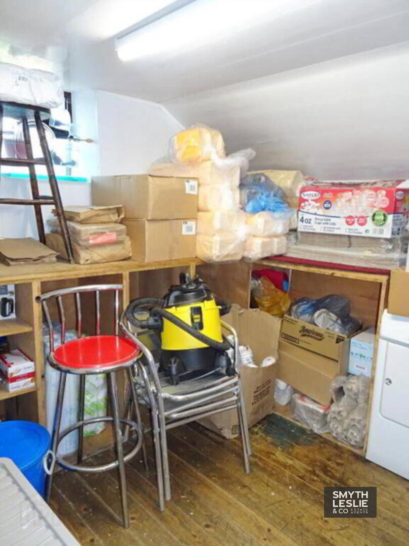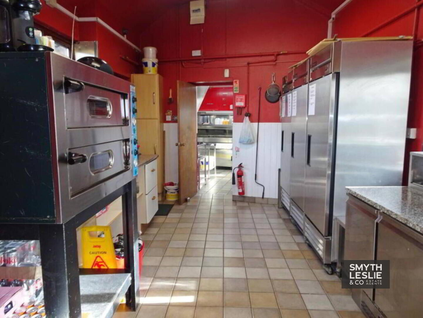 Preparation Room: 20` x 10` Tiled floor, fully equipped including pizza oven, refrigeration units, PVC exterior door to rear yard for deliveries, protective PVC cladding.