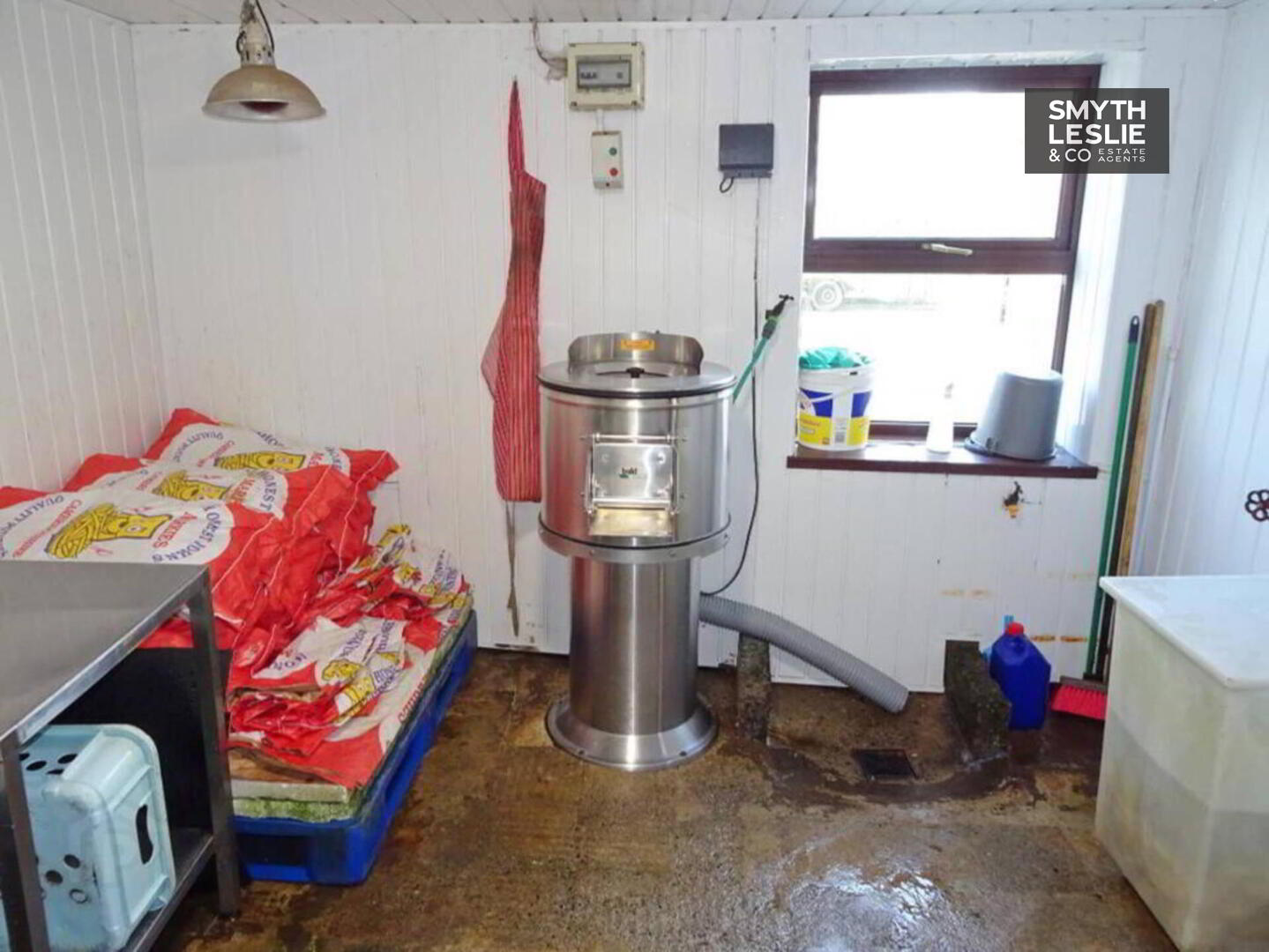 Potato Chipping Room: 10`4 x 8`10 Drainage system to floor, PVC protective cladding to ceiling and walls, PVC exterior door to yard and deliveries.