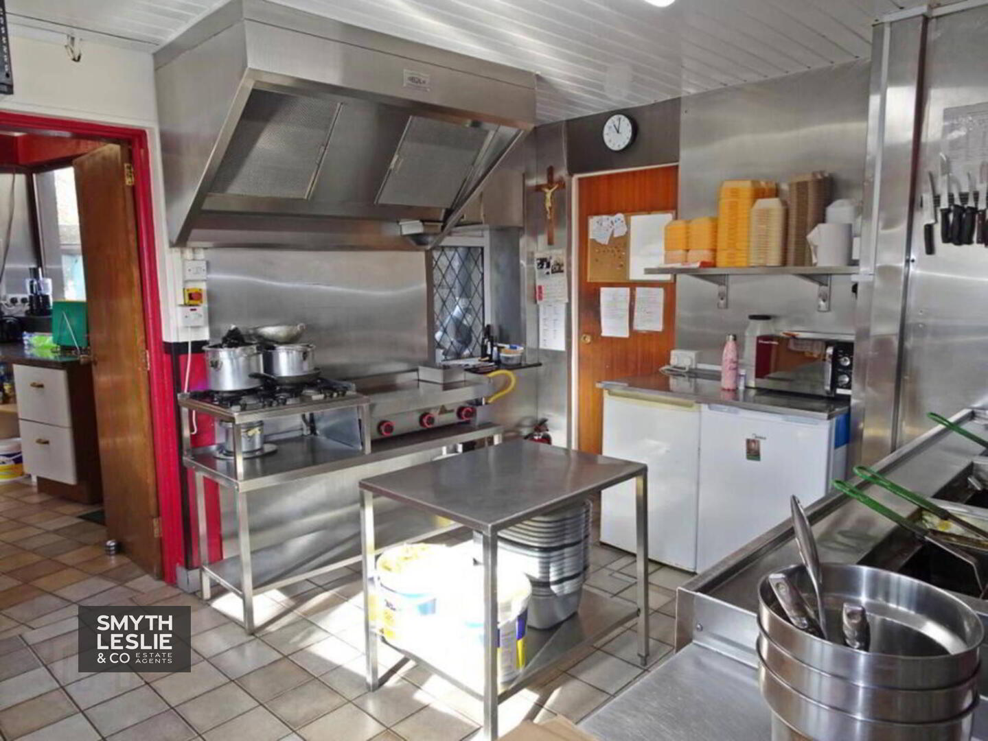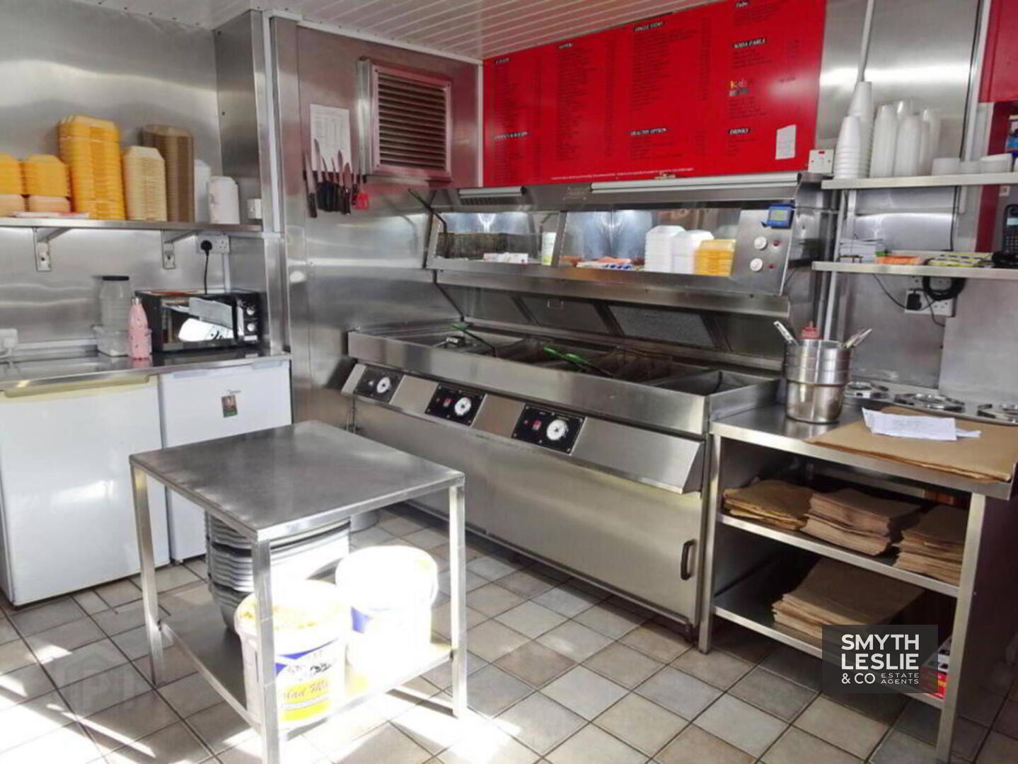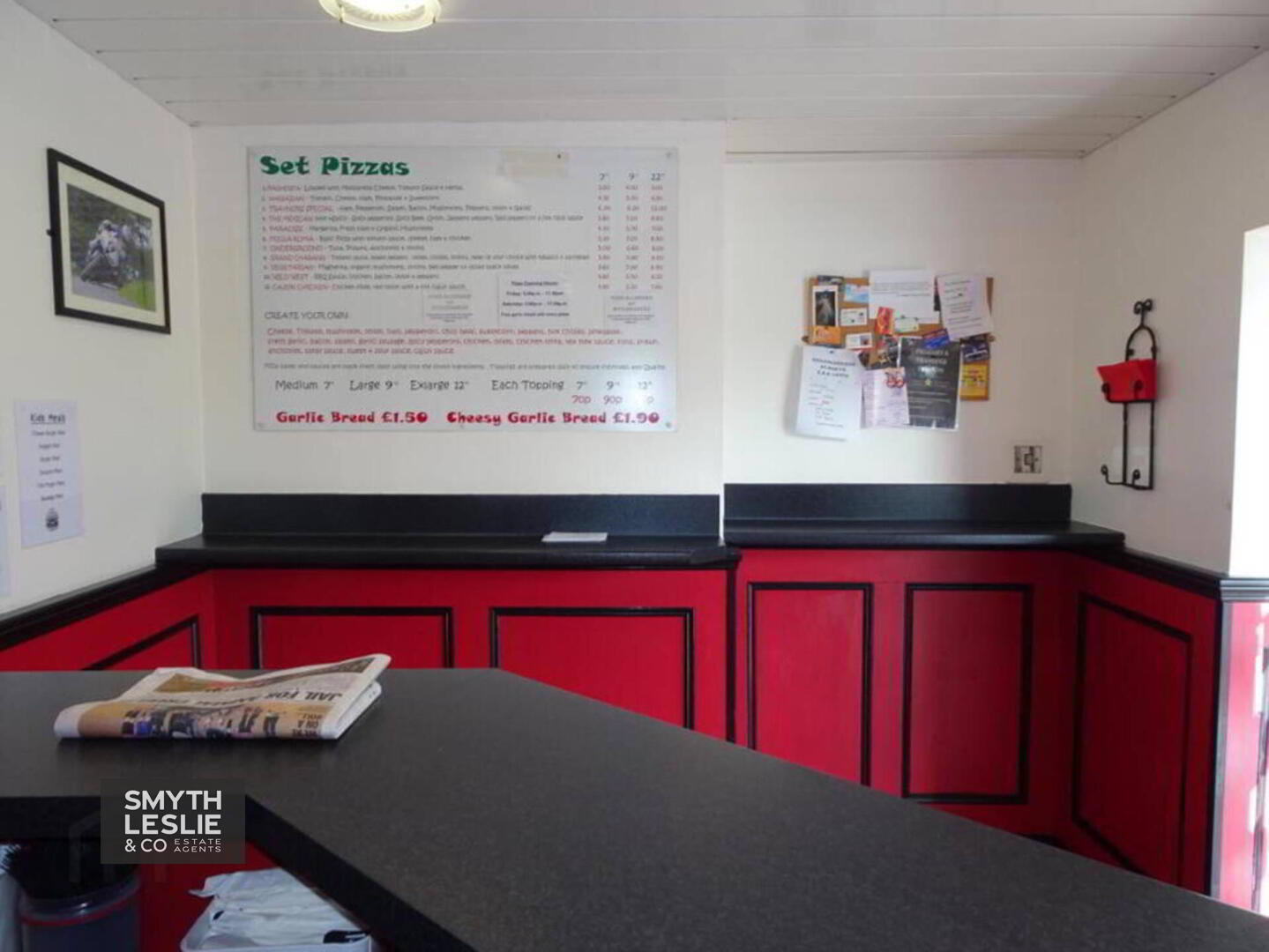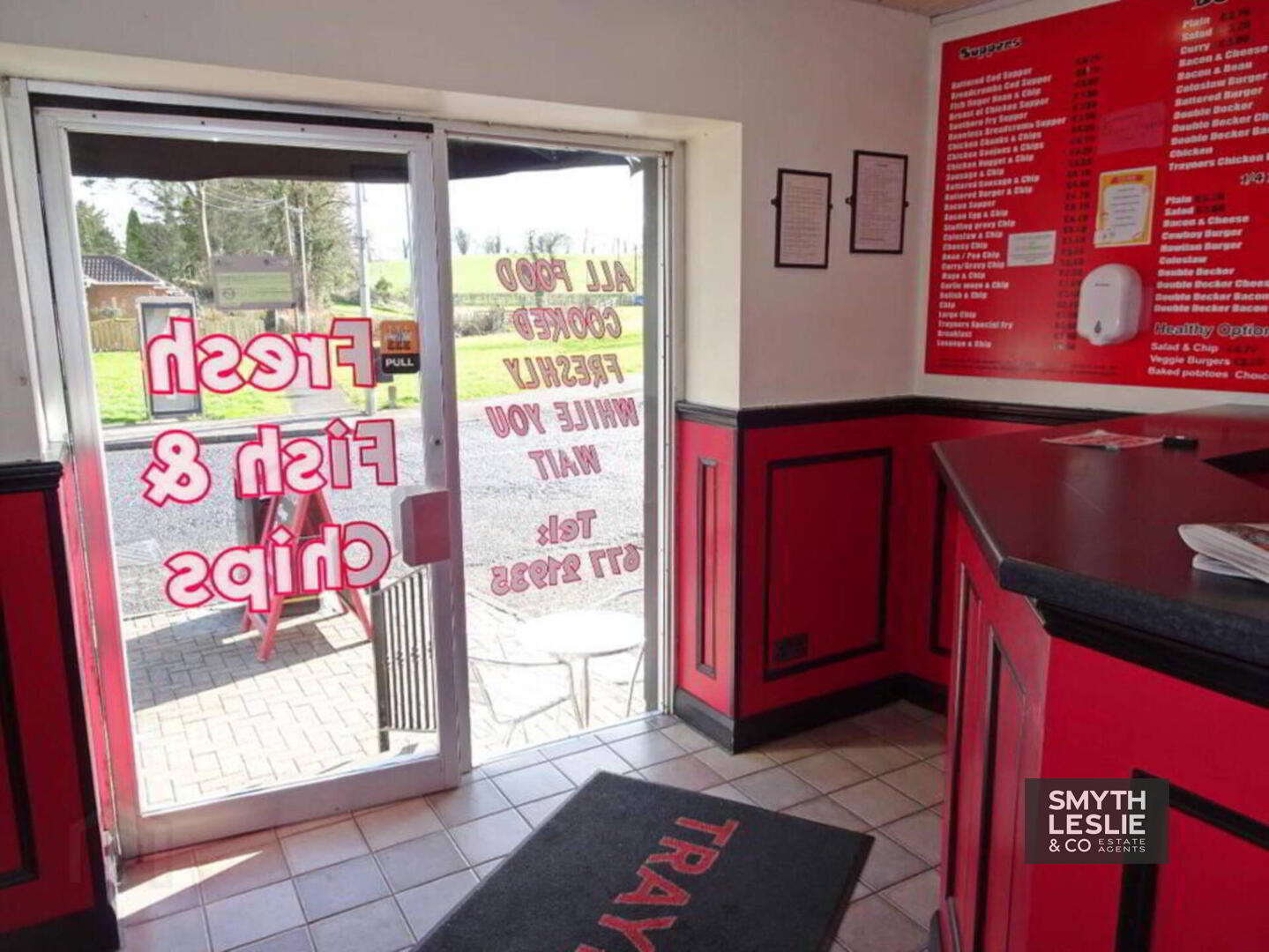Public Area: 11` x 8` (widest points) Fitted counter, glazed door and show window, tiled floor, PVC protective cladding.