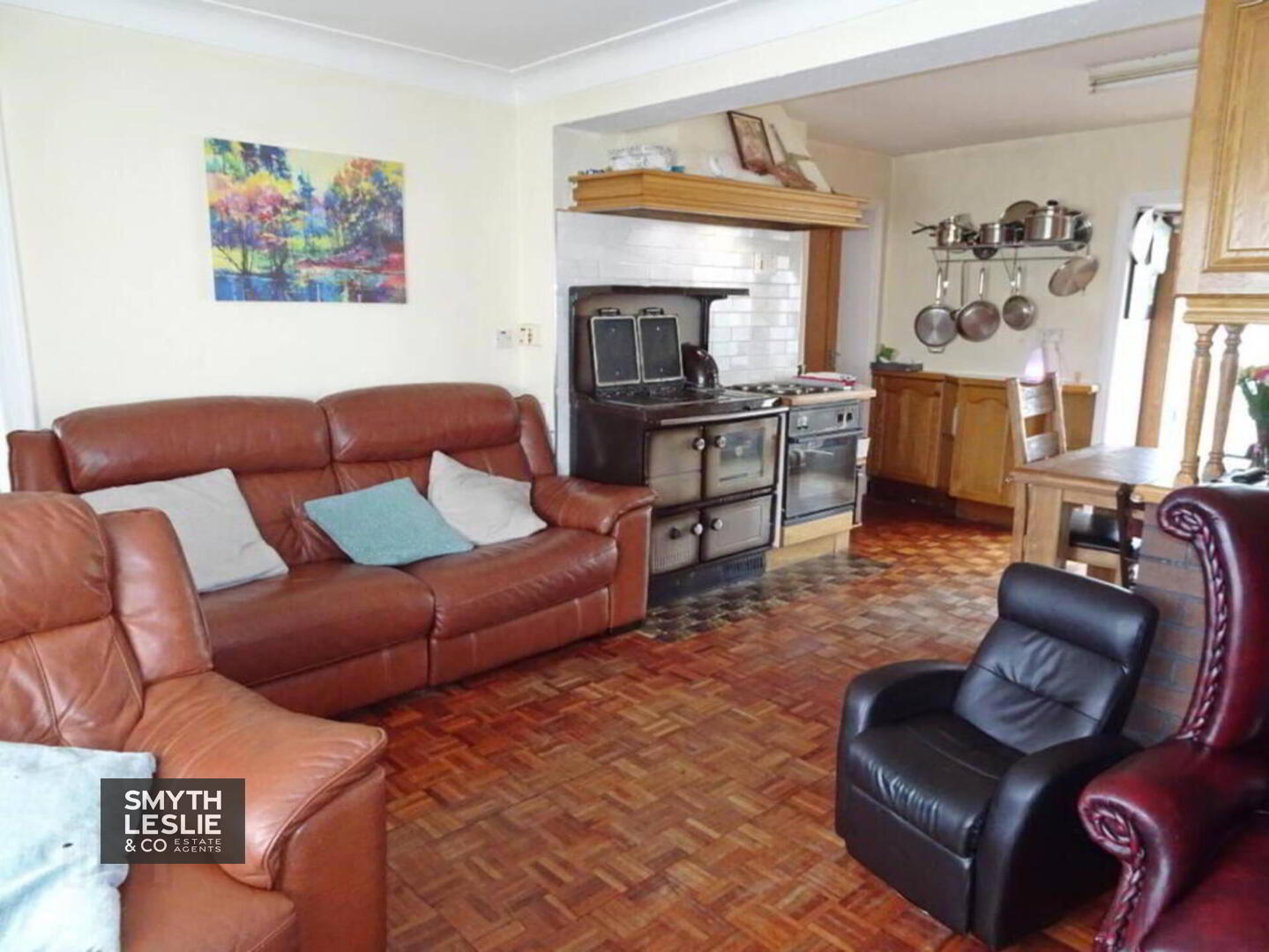 Kitchen: 15`0 x 10` Stanley oil fired cooker fitted Kitchen with a range of high and low level units, integrated hob, oven and grill, stainless steel sink unit, block wood floor, tiled splashback, extractor fan hood.